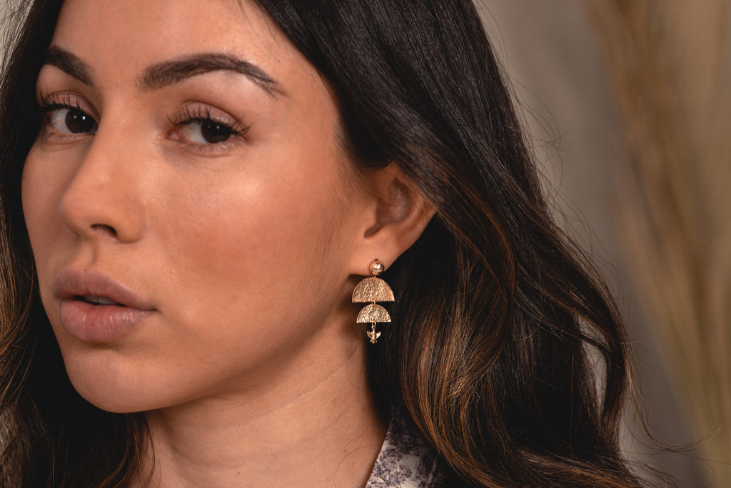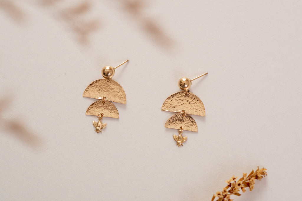 Les boucles d'oreilles BHUTAN de notre collection YIN REFLECTION sont une pièce maîtresse saisissante conçue pour captiver. Elles présentent des pendentifs en forme de demi-lunes inversées et des breloques symboliques en forme d'abeille. Suspendues sur un clou perlé, elles incarnent l'essence de la beauté naturelle et du patrimoine culturel du Bhoutan, offrant un mélange d'élégance et de symbolisme qui en fait une pièce remarquable dans toute collection.