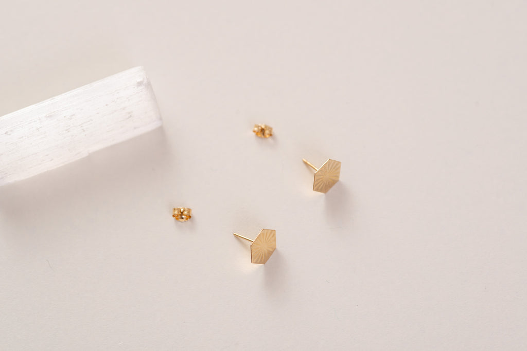 Nos puces NEPAL hexagonales à motif de poussière d'étoile sont inspirées du Népal. Ces boucles d'oreilles arborent une forme hexagonale unique ornée d'un motif de poussière d'étoile, où des lignes rayonnent du centre vers les bords, symbolisant le riche patrimoine artistique du Népal. Fabriquées avec un souci du détail méticuleux, ces boucles d'oreilles capturent l'essence de la collection YIN REFLECTION, offrant un mélange d'élégance et de signification culturelle qui résonne à chaque port.