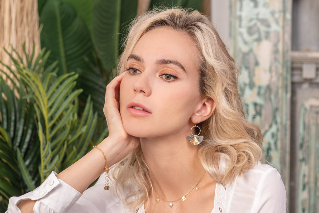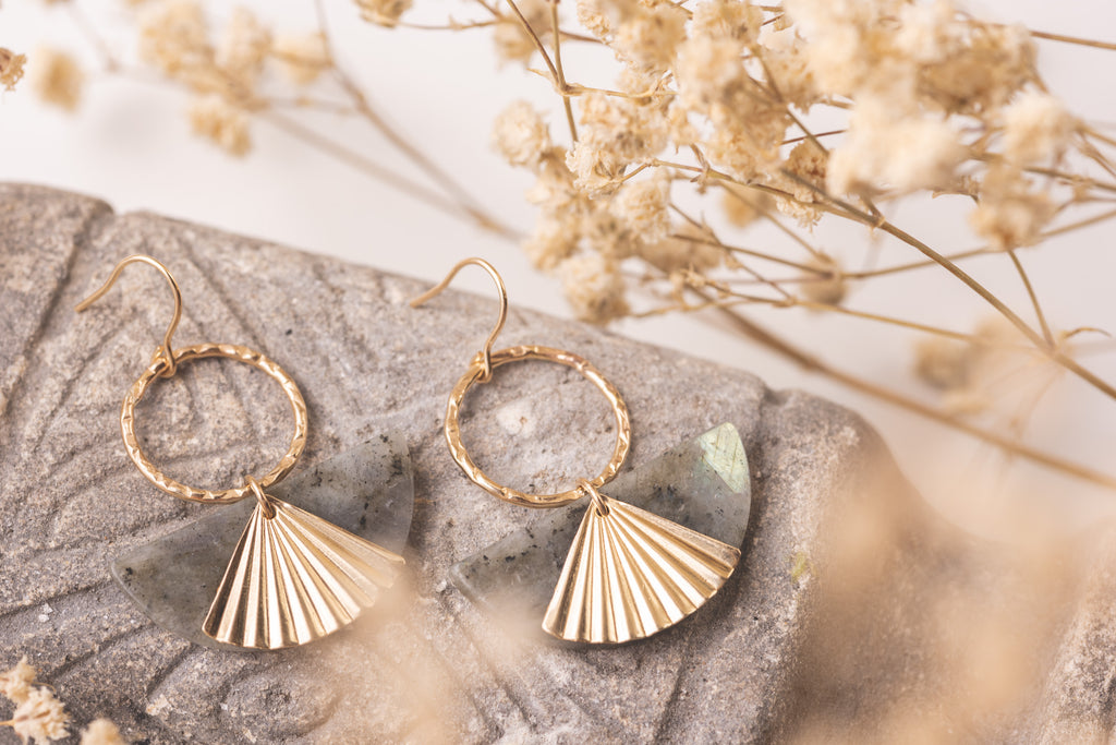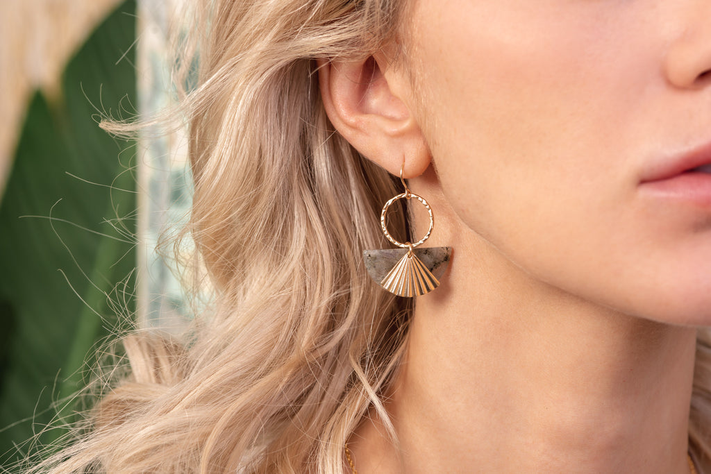Embarquez pour une croisière sur le Mékong avec notre paire de boucles VIETNAM en gold filled 14 carats et leur pierre naturelle de Labradorite. La forme de demi-lune combinée à l’éventail renversé en gold filled forment cette pièce unique et emblématique dont vous ne pourrez plus vous séparer.